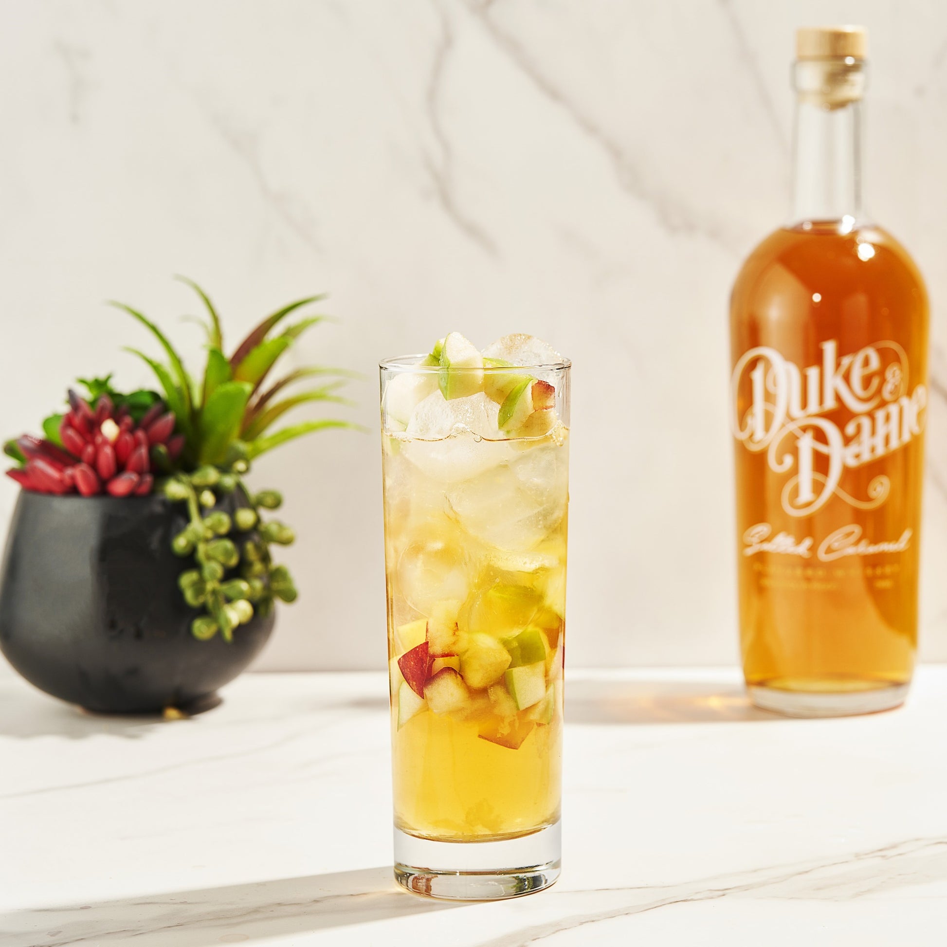 Experience the harmonious blend of aged bourbon and corn whiskies infused with 100% natural salted caramel in Duke & Dame's Salted Caramel Whiskey. Crafted to appeal to both whiskey enthusiasts and newcomers, this spirit offers a rich, balanced, and smooth profile with only 1 gram of sugar per serving.