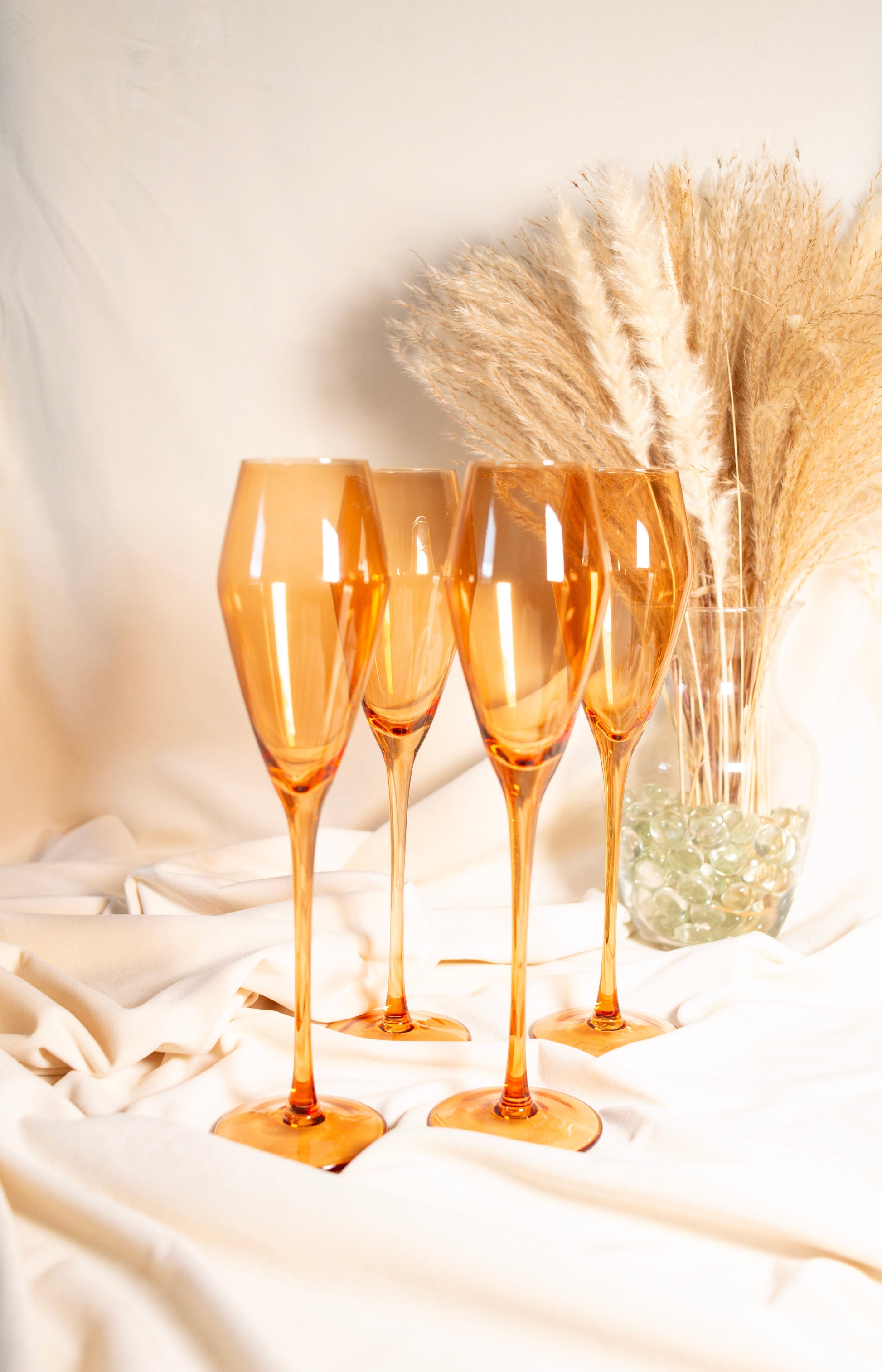 The Silk Brandy Brown Champagne Tulips – Set of 4 are designed for those who appreciate quiet luxury. Each hand-blown tulip glass features a warm, silky brown tint that enhances every pour with tasteful depth. Whether you’re celebrating milestones with champagne or enjoying crafted mocktails, these tulips bring a refined and intentional vibe to your glassware collection.