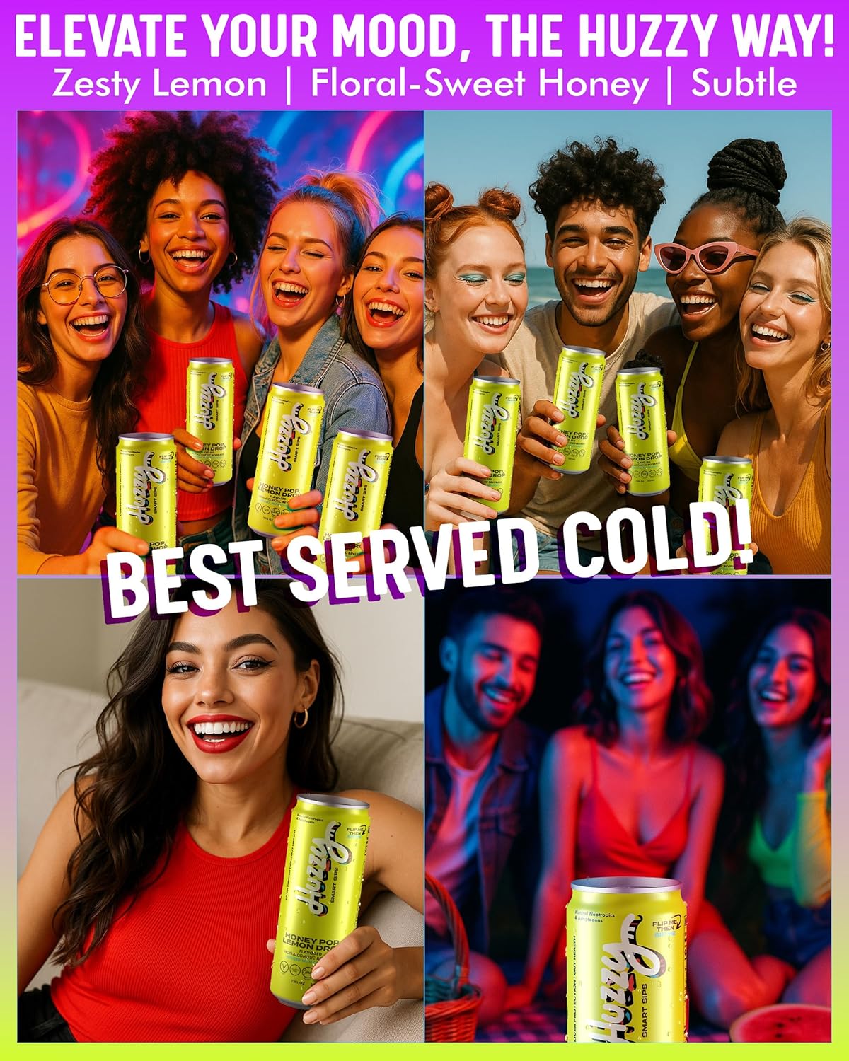 Discover a refreshing new take on the classic lemon drop with Huzzy Smart Sips Honey Pop Lemon Drop. This alcohol-free functional cocktail delivers bright citrus flavor balanced with smooth honey-inspired sweetness, creating a lively and satisfying sip without the alcohol. Crafted for mindful drinkers, it blends vibrant flavor with plant-based functional ingredients designed to support a more balanced social drinking experience. With no refined sugar, caffeine, or artificial colors, it’s a clean, modern option for those looking to enjoy a cocktail-style beverage any time of day. Perfect for gatherings, celebrations, or a relaxing evening at home.